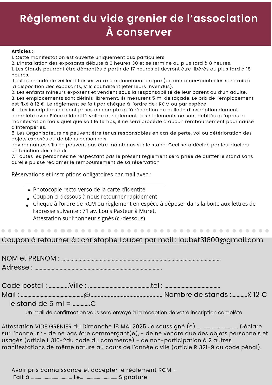 Pour réserver votre emplacement ou pour plus d’informations, contactez-nous au 06 61 37 60 17 ou par email à loubet31600@gmail.com.