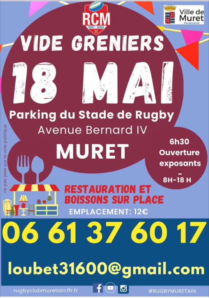 Rendez-vous le 18 mai pour un vide-greniers organisé par le Rugby Club Muretain, sur le parking du Stade de Rugby, Avenue Bernard IV, à Muret. Les exposants auront accès au site dès 6h30, et l’événement sera ouvert au public de 8h à 18h.